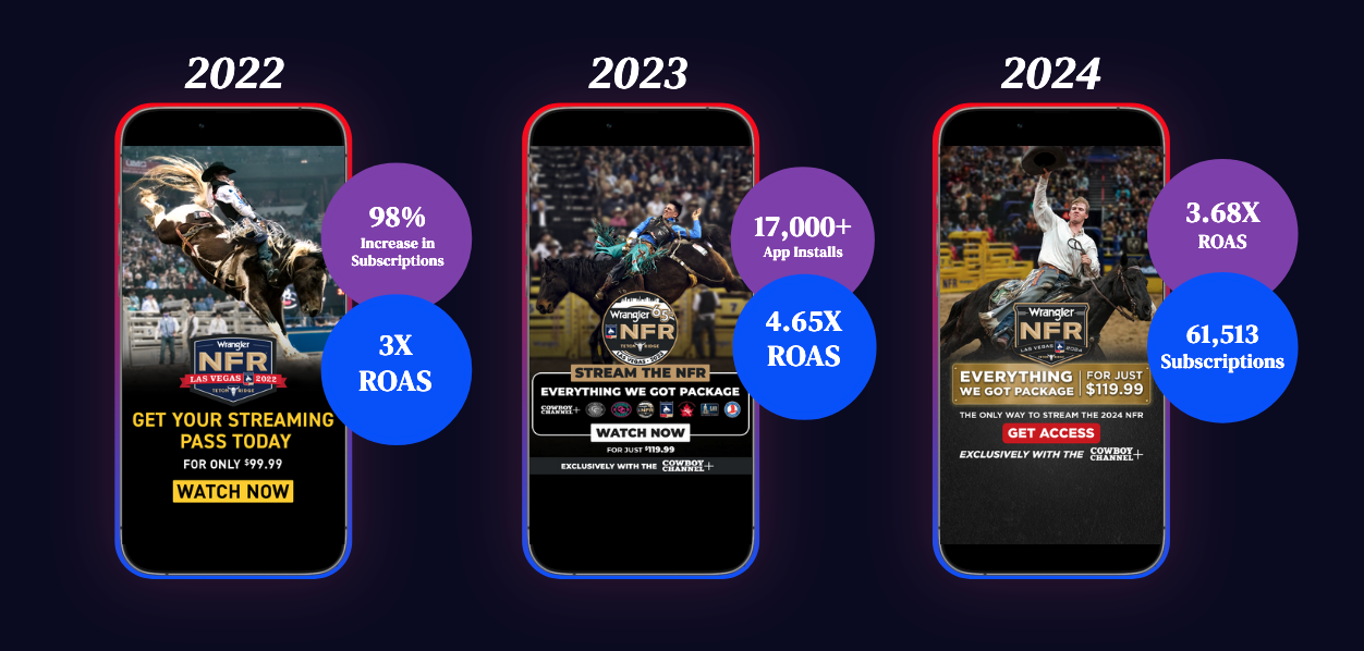 The Cowboy Channel is the official broadcaster of the National Finals Rodeo. Creative and marketing delivery was managed across paid channels to support rapid growth during the event period.